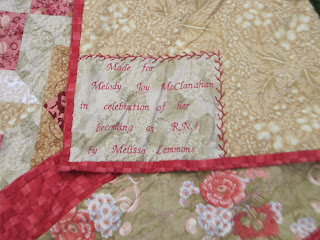 I "wrapped" the present by folding the layette inside the quilt, folding back top layer to show the label and tying with a big yellow ribbon. The label says "Made by Aunt Melissa for her very first niece. July 23rd, 2009.